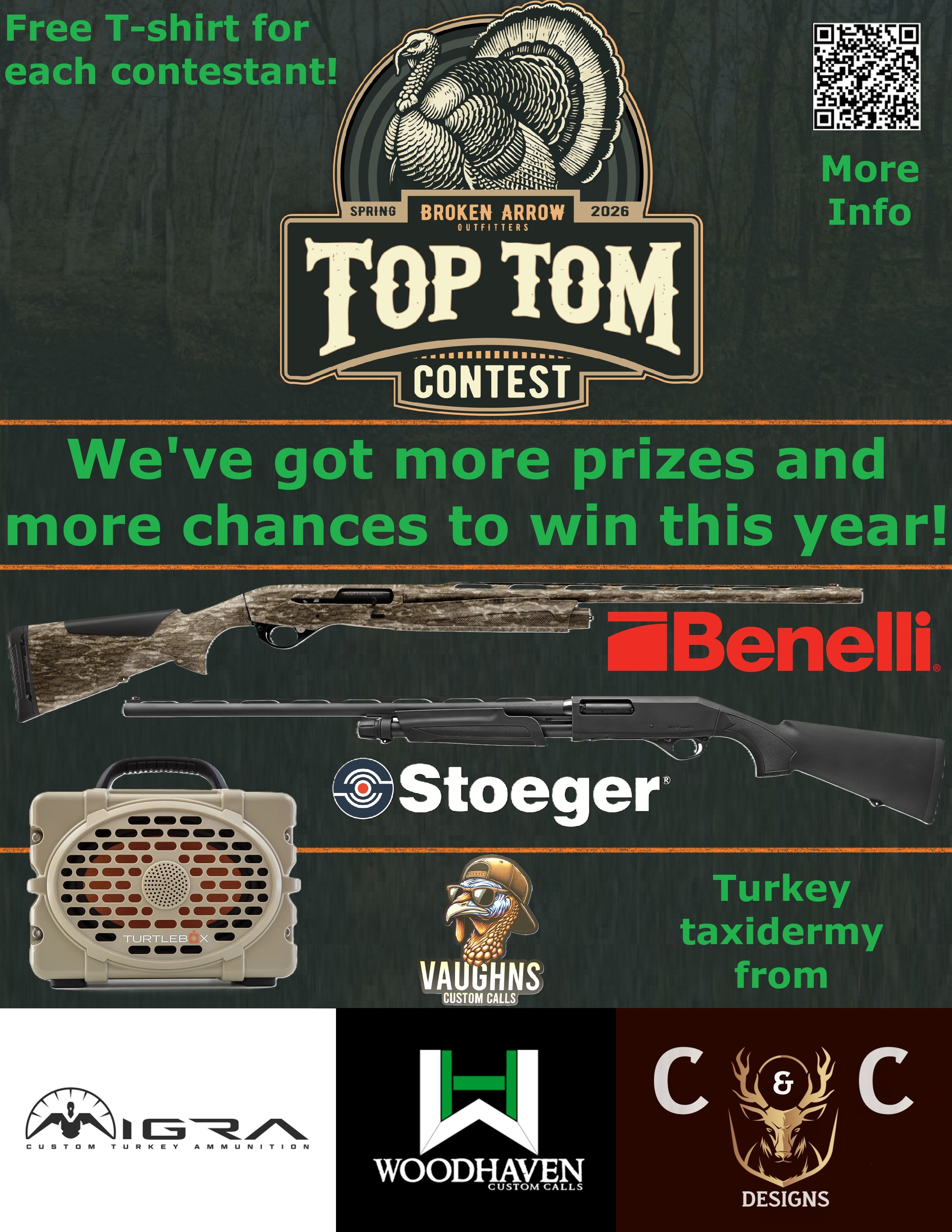 Awards: For the 2026 Top Tom Spring Turkey Contest will take place on May 16th at 5:00 P.M. at Broken Arrow Outfitters (food will be provided).
