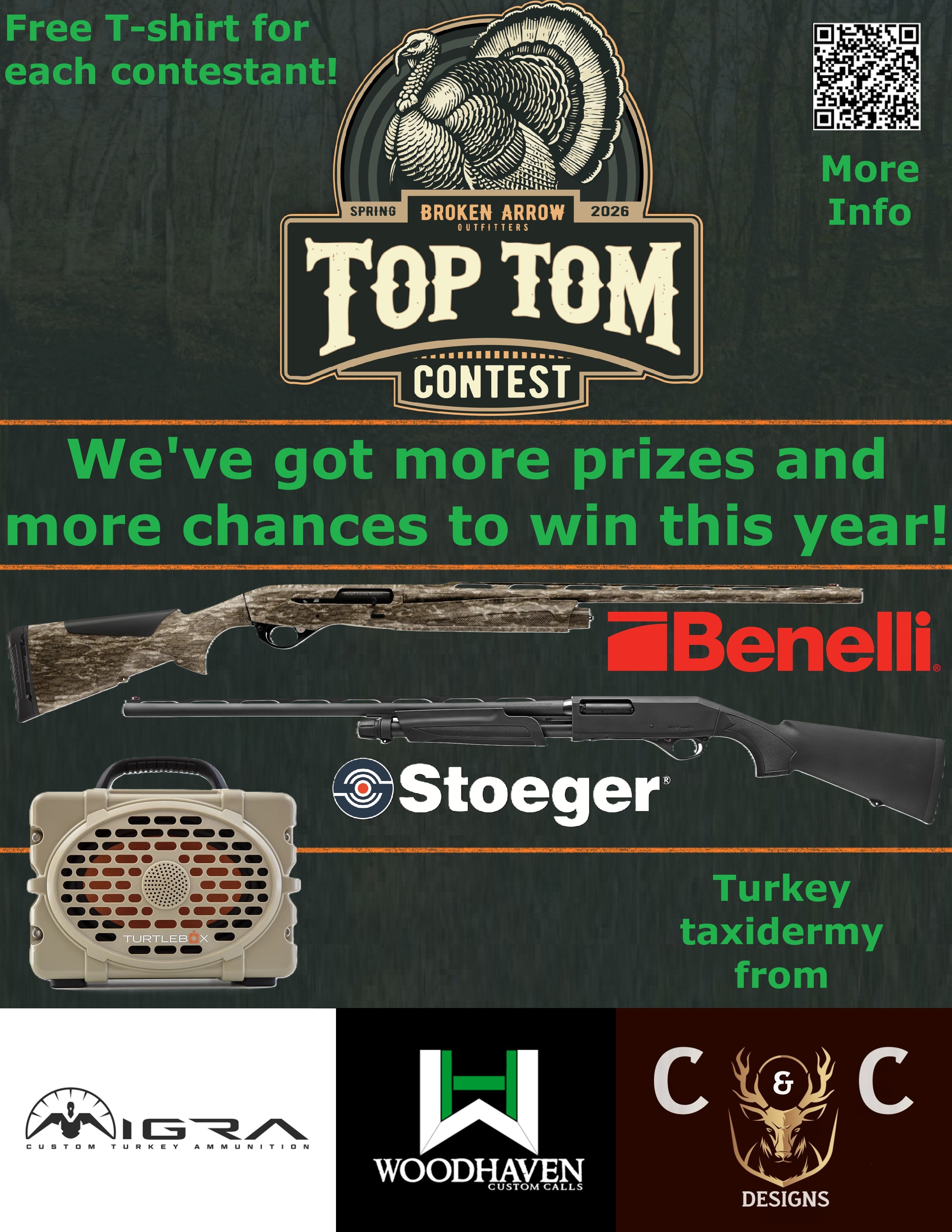 Awards: For the 2026 Top Tom Spring Turkey Contest will take place on May 16th at 5:00 P.M. at Broken Arrow Outfitters (food will be provided).