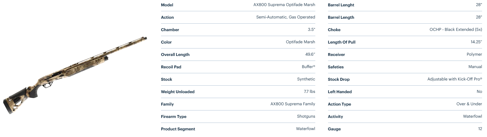 The AX800 Suprema is the most advanced waterfowl shotgun Beretta's ever built, engineered for total control, comfort, and reliability in the toughest conditions. At its core is the B-LINK Pro gas system, designed for faster cycling and cleaner operation. It runs 36% faster and 46% cleaner than any gas system they’ve made, outperforming even their top-of-the-line A400 Xtreme Plus. That means softer recoil, more consistent performance, and less time cleaning in between hunts. Paired with the Steelium Pro barrels and a Kick-Off Pro stock that cuts felt recoil by up to 70%, every feature is designed for serious hunters who demand more from their gear. This is performance that doesn’t flinch from the first to the last pull of the season. Built for the blind, the boat, and whatever the weather throws at you because the hunt doesn’t wait and neither do you.
