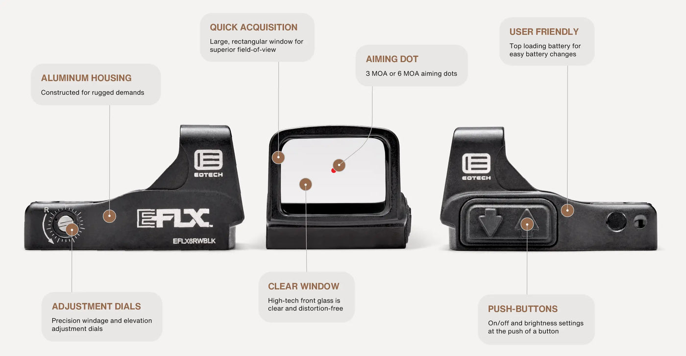 EOTECH’s first reflex optic, the EFLX® Pistol Optic is ideal for professional use, hunting, home defense, and can be used on a variety of platforms. The EFLX® base is configured to the Leupold® Delta Point Pro™ footprint and will adapt to appropriately milled slides or onto a rear dovetail mounting adapter. The EFLX® is also ideal as a 1x solution on rifles with magnified optics. Its durable, heavy duty aluminum housing provides a large, square viewing window, similar in shape to EOTECH’s HWS. A top load, single 2032 battery provides roughly 25,000 hours of run time.